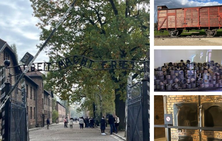 Unfathomable — yet real. Chaos.Disorientation.Confusion.Confiscation —of clothing, hair, identity, life.Tattooed numbersreplace names. Lies.Deception.Arbeit Macht Frei —“Work will make you free.” Evidence:suitcases, shoes,prayer shawls, phylacteries —remnants of Jewish faith,proof of the Nazi magnitude of murder. Evil.Zyklon B — poisonous pellets,stealing 1.1 million lives:young and old,disabled and abled —indiscriminate death. On the other side:of barbed wire,of electric fence,of the world,of humanity,of life.…